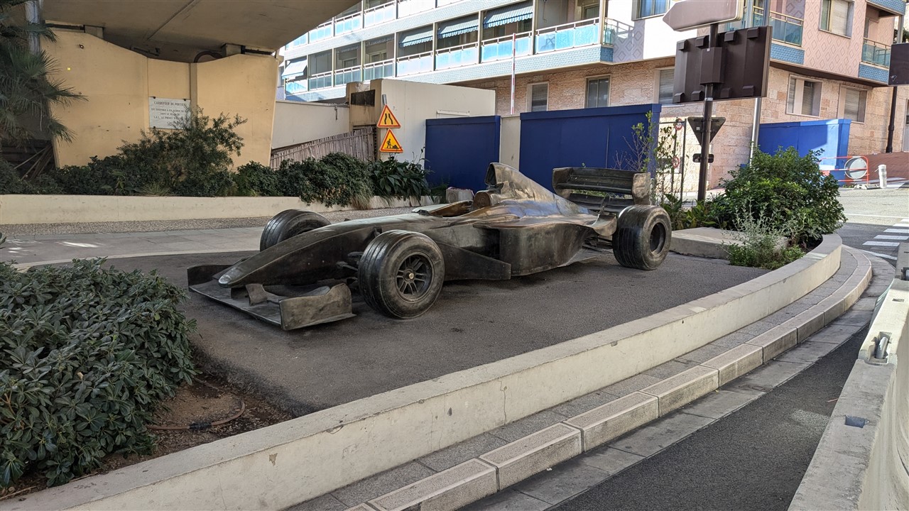 On foot, you pass a statue of an F1 car (possibly a 1990s Williams?)