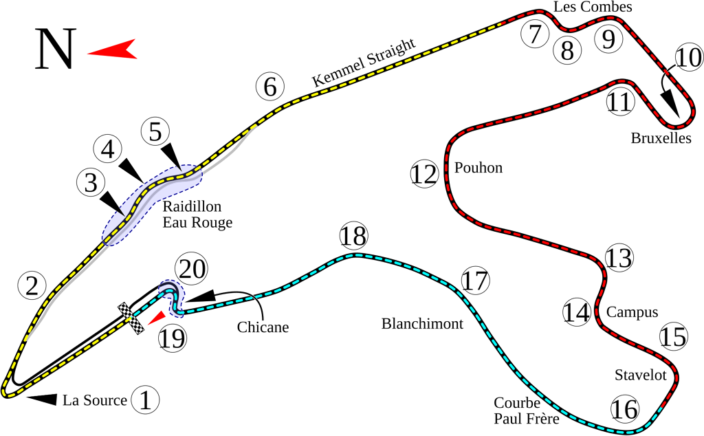 In the clear blue sky, the Goodyear 'blimp' cast a huge shark-like shadow from time to time and we 'enjoyed' a rendition of the Belgian national anthem (yet another terrible idea imported from the USA) before a group of small aerobatic planes trailed black, yellow and red smoke and then a large pyrotechnic display on the start-finish line (in front of the 'new' pits) produced a cloud of smoke in the Belgian colours.